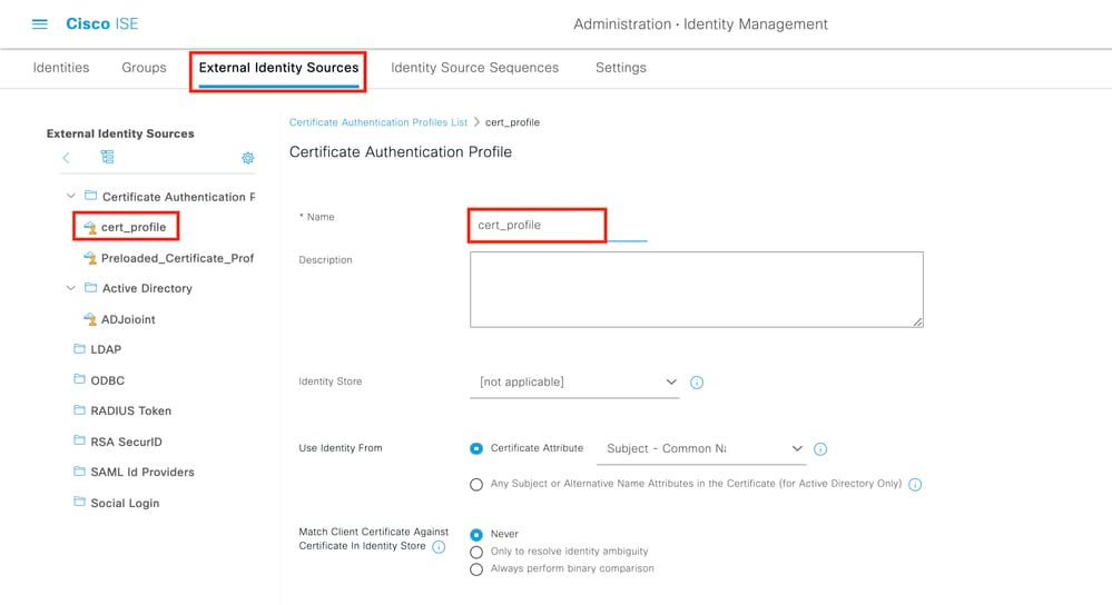 Navigate to ISE > Administration > External Identity Sources > Certificate Profile. Here create a new certificate profile or use the default certificate profile.