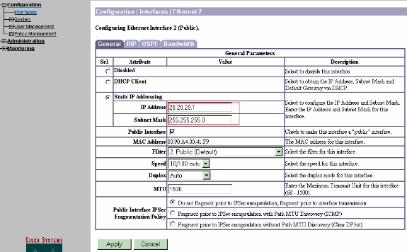 After you bring up the GUI, select Configuration > Interfaces > Ethernet 2 (Public) to configure the Ethernet 2 interface.