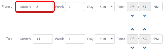 Step 15. In the To area, repeat the steps from Step 11 to Step 14 to specify the month, week, day, and time you want DST to end.