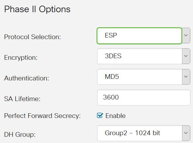 Step 5. From the Protocol Selection drop-down list in the Phase II Options area, choose a protocol type to apply to the second phase of the negotiation. The options are: