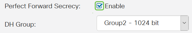 Step 9. (Optional) Check the Enable Perfect Forward Secrecy check box to generate a new key for IPsec traffic encryption and authentication. Perfect Forward Secrecy is used to improve the security of communications transmitted across the Internet using public key cryptography. Check the box to enable this feature, or uncheck the box to disable this feature. This feature is recommended.