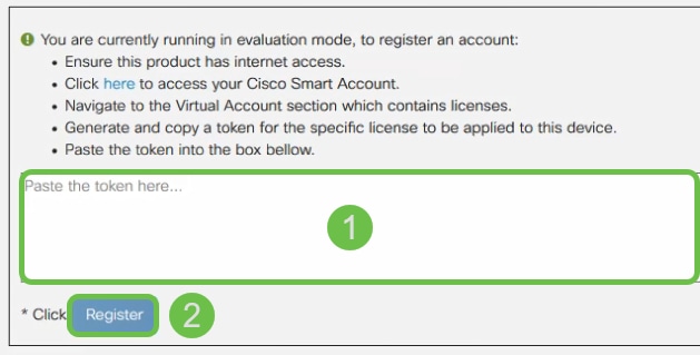 Step 7. If your device is unregistered, your License Authorization Status will be listed as Evaluation Mode. Paste the token (Step 4 of this section) that you have generated from the Smart Licensing Manager page. Then click Register.