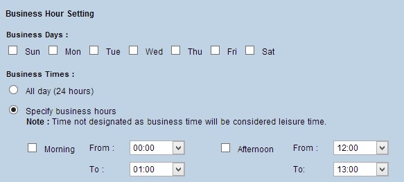 Step 3. If Specify Business Hours is chosen, check the Morning check box and choose the From and To times from the drop-down lists to specify the business hours in the morning. Check the Afternoon check box and choose the From and To times from the drop-down lists to specify the business hours in the afternoon.