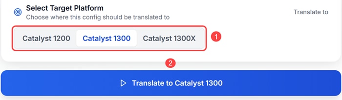 Select the target platform and click the corresponding blue Translate to button. In this example, Catalyst 1300 platform is selected.