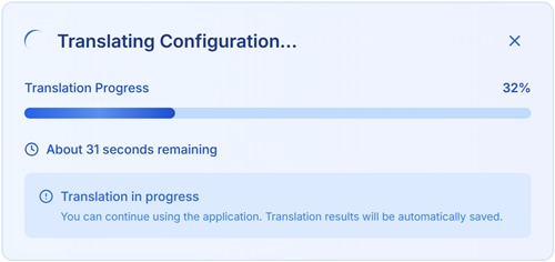 You will see a progress indicator in the Translation Result pane of the tool UI. The time it takes for a translation to complete is dependent on the size and complexity of the source configuration file.