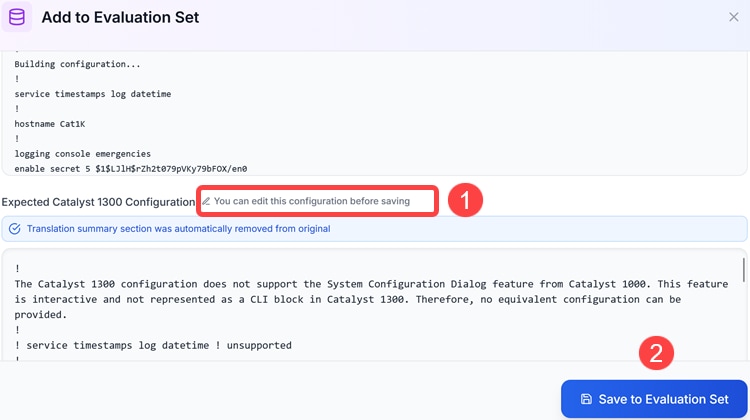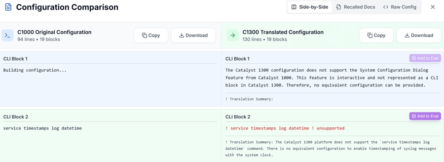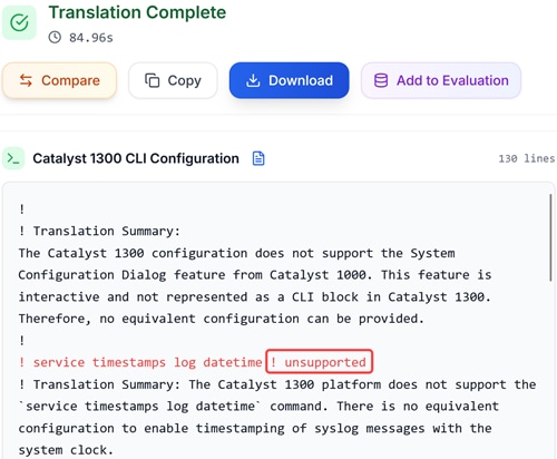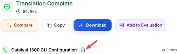 Once the translation is complete, you have the option to Compare, Copy, Download, or Add to Evaluation the translated configuration.