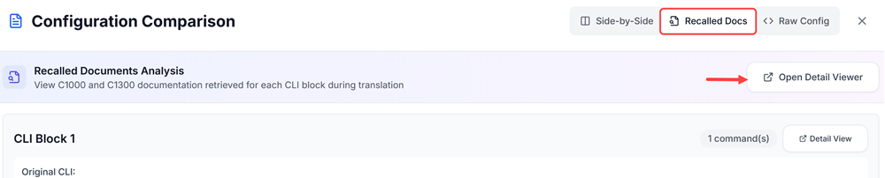 Under Configuration Comparison, the Recalled Docs show specifically how the translation occurred and what Cisco documents were referenced for the translation. Click on Open Detail Viewer to see specific sections of the documents that were referenced.