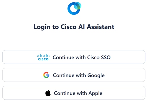 When connecting, you need to sign in with Cisco to access the tool. Users can choose to use their Cisco account, or a Google or Apple Account.
