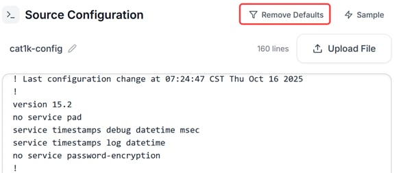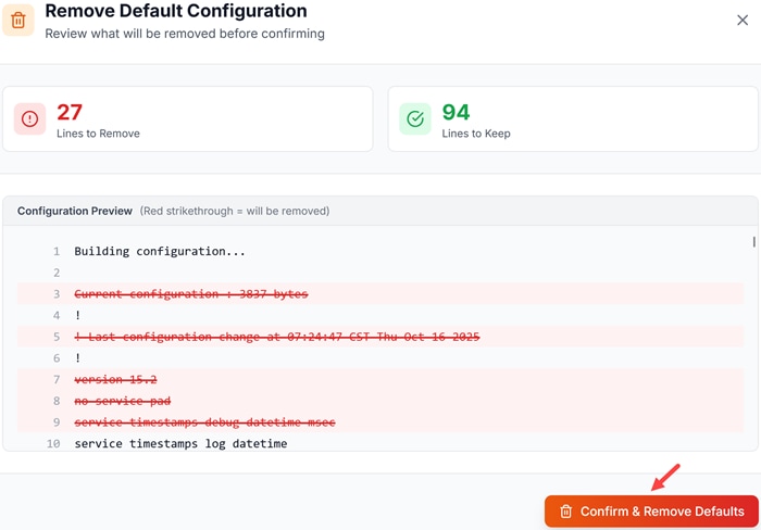 (Optional) Once you have confirmed the upload, you can press the Remove Defaults button. This will delete some default information that will be listed in the running configurations in IOS that are not needed.