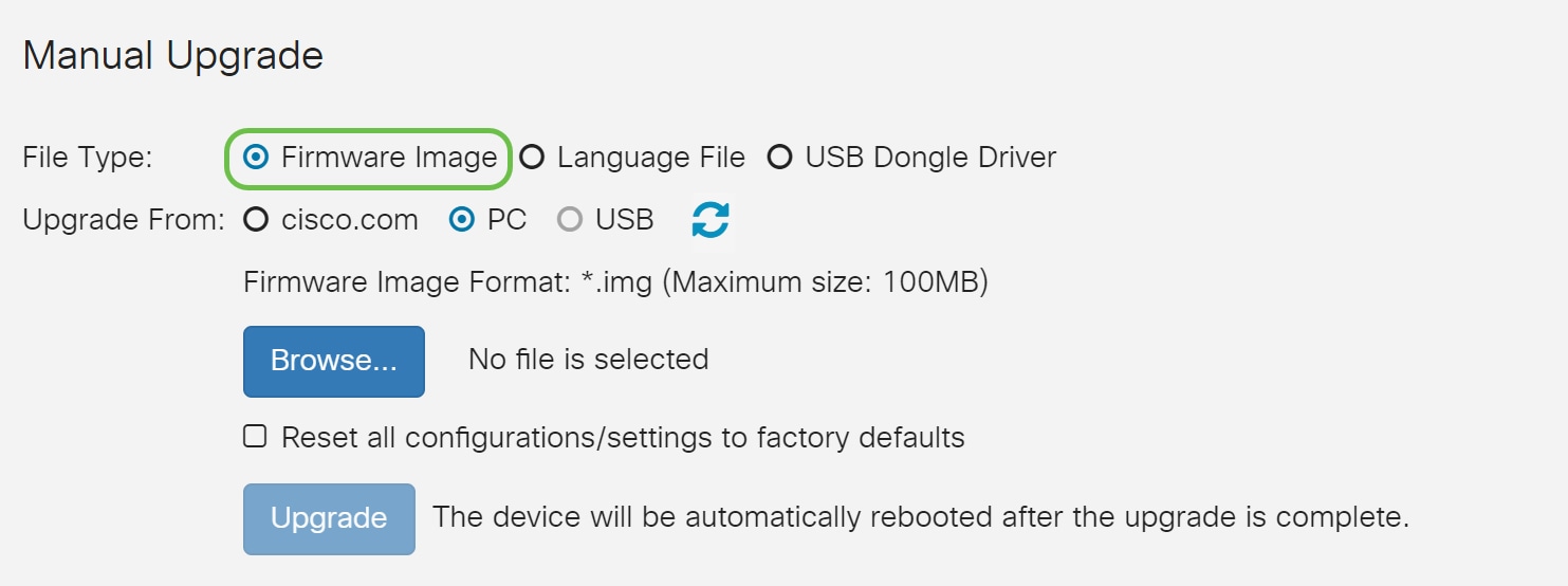 Under Manual Upgrade section, click on the Firmware Image radio button for File Type.
