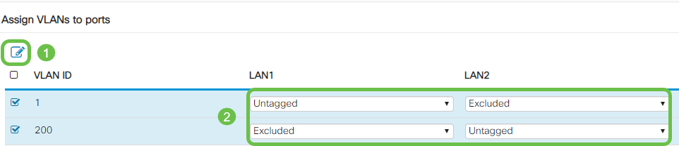 In this example, on LAN1 we assigned VLAN 1 as Untagged and VLAN 200 as Excluded. For LAN2 we assigned VLAN 1 as Excluded and VLAN 200 as Untagged.