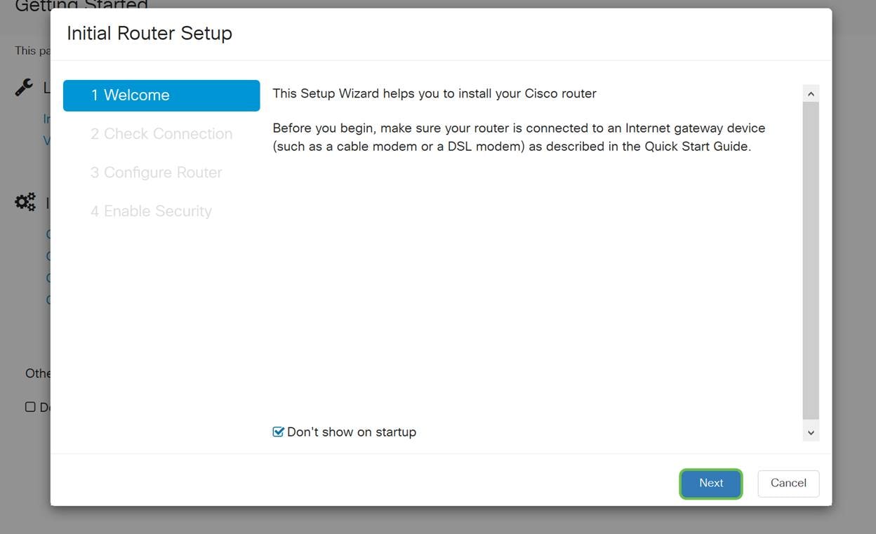 Click Login. The Getting Started page appears. Now that you have confirmed the connection and logged in to the router, jump to the Initial Configuration section of this article.