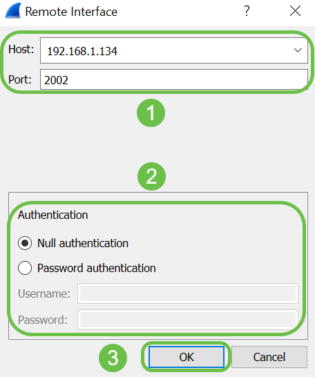 On the new Remote Interface pop-up window, enter the Host: IP address details (the WAP device IP where you have started the remote capture) and Port: number (configured on WAP for remote capture). In this case the WAP device IP was 192.168.1.134. You may select Null authentication or Password authentication option based on your settings. If you select, Password authentication then please enter the Username and Password details accordingly. Click OK.