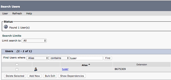 From the Find and LIst Users menu search for and select the CUCM end user you wish to configure for Jabber for Android.