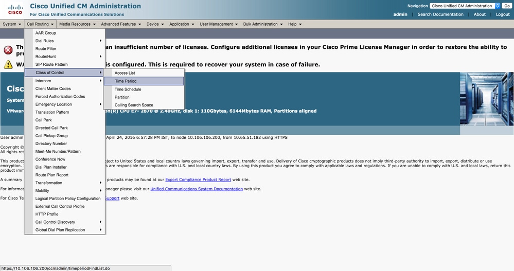 - On the Unified CM Administration section of the web page, navigate to Call Routing > Class of Control > Time Period as shown in this image.