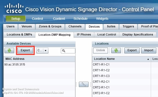 TIP : If you do not yet have any information for Locations and DMPs in the Cisco Vision Director Server, you can export an empty file that will have the appropriate formatting for headings only so that you can add new Locations and DMPs from a spreadsheet application.