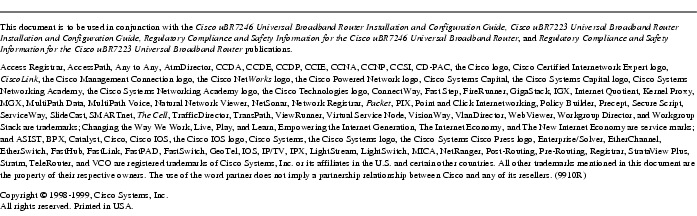 Use this document in conjunction with the and Regulatory Compliance and Safety Information for the Cisco uBR7200 Series Universal Broadband Router that shipped with your Cisco uBR7246 VXR, Cisco uBR7246, or Cisco uBR7223.
