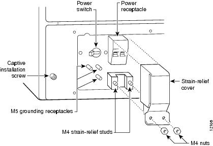 Replace the strain-relief cover over the +48V and -48V leads and secure the cover to the strain-relief studs using the two M4 nuts with a 7 mm wrench or nut driver (or adjustable wrench). (See .)