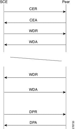 The SCE initiates the TCP connection (the only transport layer currently supported by SCE). After the TCP connection is established, the SCE sends the CER message. The CER message is answered by the CEA message. At this stage the connection is up. The WDR and WDA messages are exchanged between the peers. The time gap between watch dog messages is defined by the Tx timer. If the peer is removed, the connection is gracefully closed by sending the DPR message and receiving the DPA message.