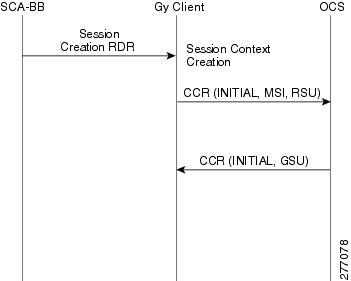 Once a login event occurs on SCA BB, it sends a Session Creation RDR if the subscriber quota is externally provisioned. The Gy interface listens to these messages and in return sends a CCR initial message to the OCS with or without quota usage information. This process is completed to allow PDP context creation on the OCS as quickly as possible.