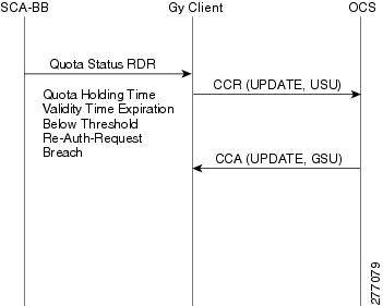 Quota usage is reported by SCA BB using the Quota Status RDR, the Gy client listens to these messages and delivers them by a CCR update message to the OCS.