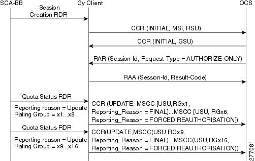 Re-Authorize Request (RAR)—Sent by any server to the access device that is providing session service, to request that the user be reauthenticated or be reauthorized. In the SCE Gy implementation, RAR messages are used by the OCS to request usage information on either a specific bucket-id or all buckets. The SCE listens to RAR messages and signals SCA BB to send usage information to the OCS. RAR messages arrive in an asynchronous manner from the server and with no correlation to any request completed by the SCE.