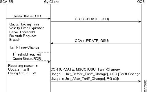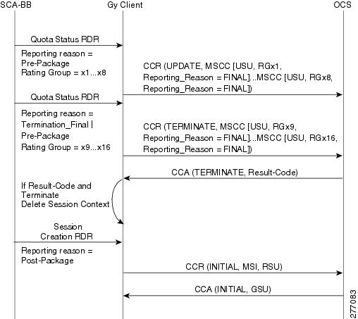 Upon package change, the SCA BB sends a Session Termination RDR, which contains the final indication and usage reporting on all the buckets and the reporting reason of the pre-package. As a result, the Gy interface sends a CCR final message with usage information. After this, the SCA BB sends a Quota Status RDR with reporting reason of postpackage, the Gy client issues a CCR initial message with bucket IDs. Figure 1-7 displays the tariff change call flow and Figure 1-8 displays the package change call flow.