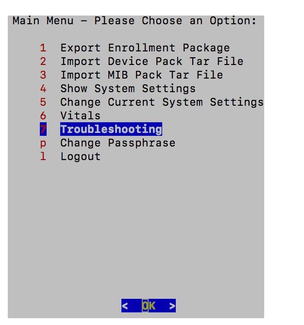 To access Troubleshooting menu, select 7 Troubleshooting from the Main Menu and click OK, as shown in the following figure: