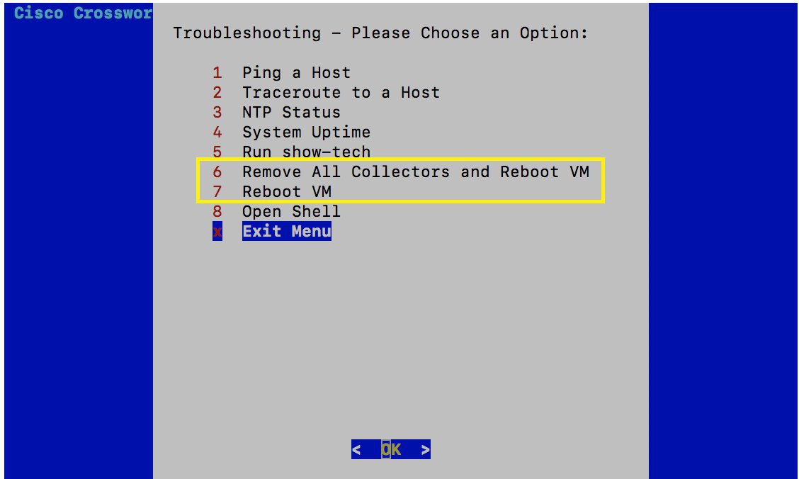 Remove All Collectors and Reboot VM: Select this option from the Troubleshooting menu if you want to remove all the collectors (functional images) and reboot VM.