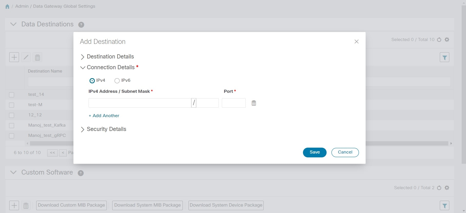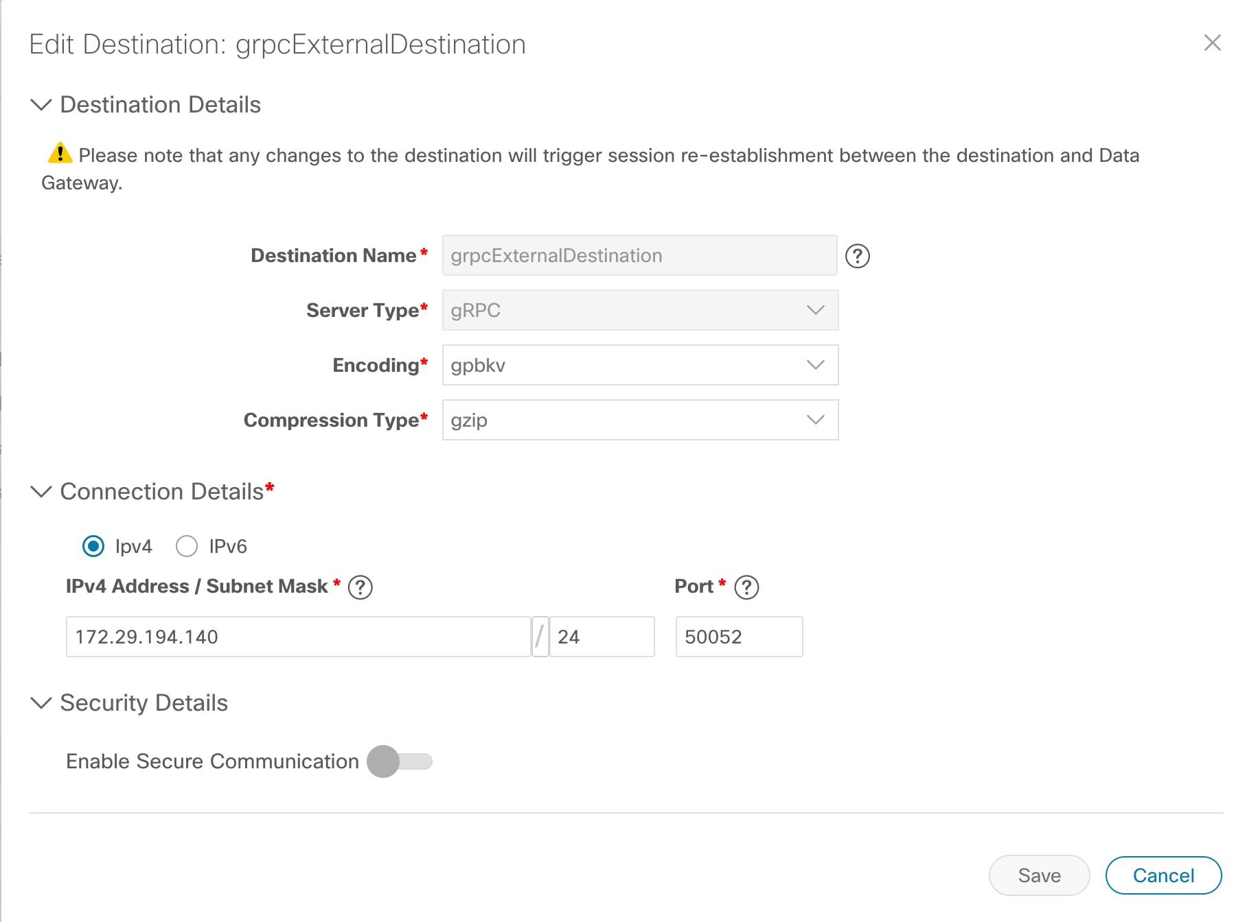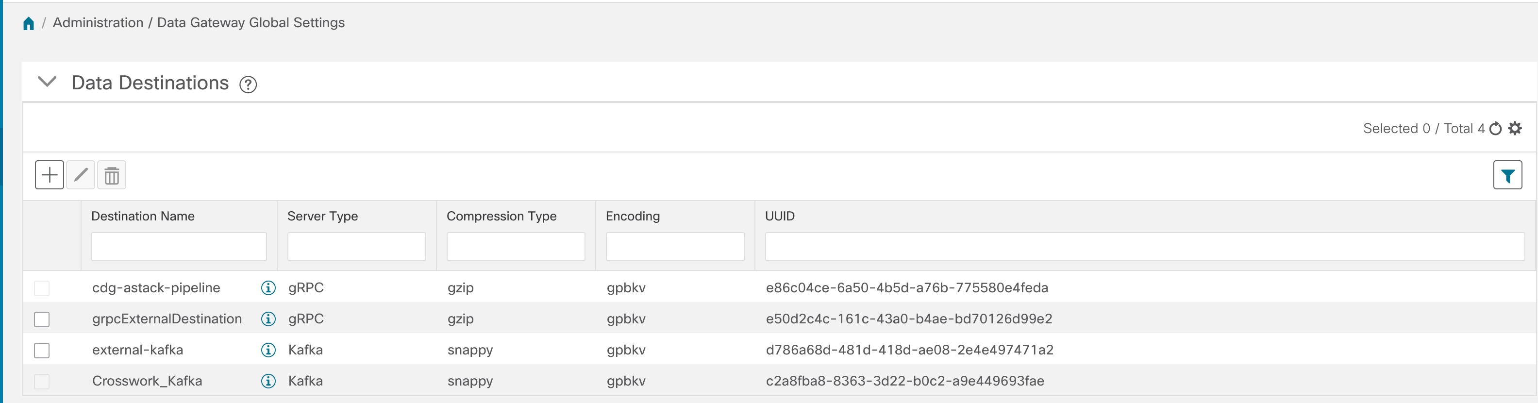Data Destination - Internal or external recipients of data collected by the Crosswork Data Gateway. By default, Cisco Crosswork is defined as a data destination. Other destinations (external users) can be defined using the Cisco Crosswork UI or APIs.