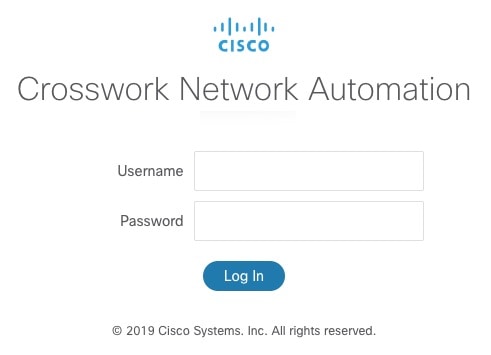 The Cisco Crosswork Change Automation and Health Insights browser-based user interface displays the login window. Enter your username and password.