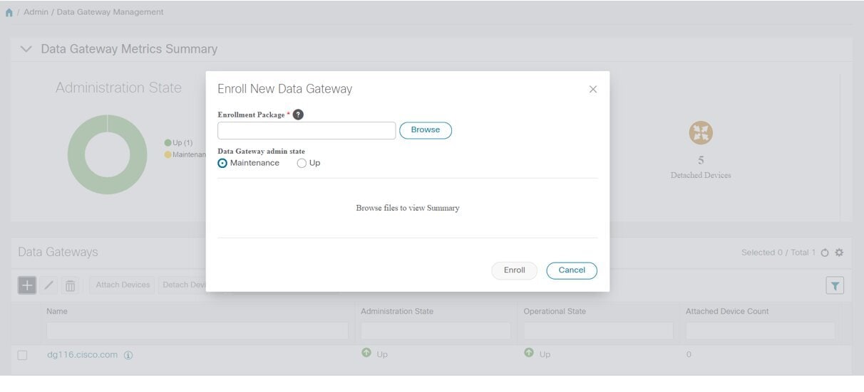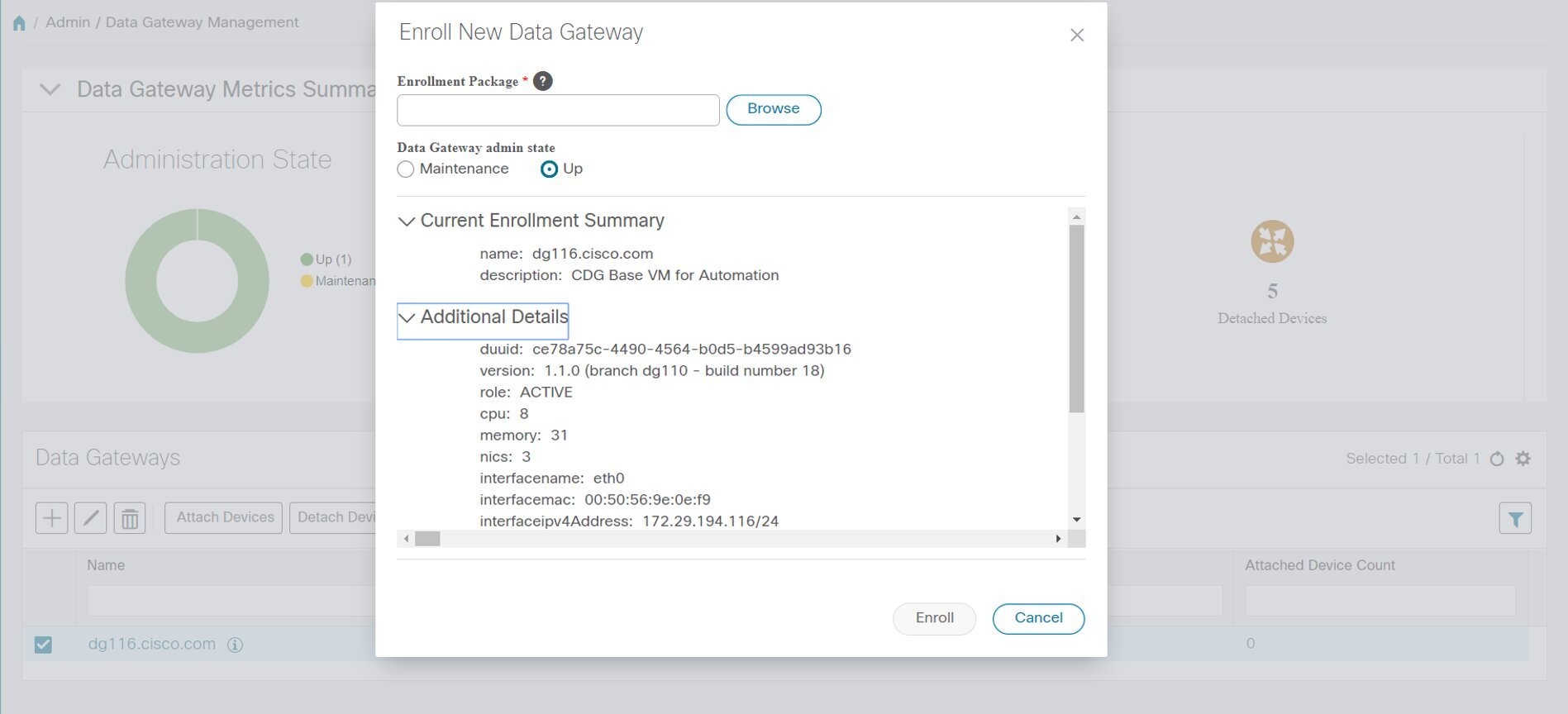 Click Enroll.Cisco Crosswork Data Gateway displays the following message upon successful enrollment: ![]() Once you click Enroll, a dialog pops up asking if you want to attach devices now or later. It is recommended to choose Later as devices must only be attached once the operational state of the Cisco Crosswork Data Gateway instance is Up.