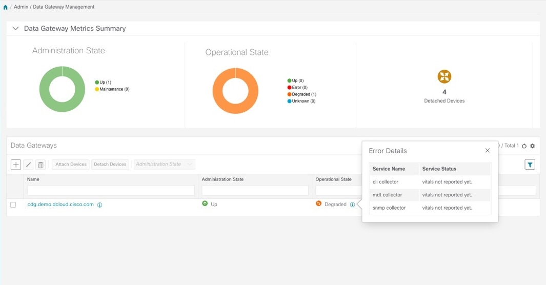 The Operational Status of a Cisco Crosswork Data Gateway instance is shown as "Degraded" until it establishes a connection with Cisco Crosswork Change Automation and Health Insights and downloads collector binary files. While it depends on the bandwidth between the Cisco Crosswork Data Gateway instance and Cisco Crosswork Change Automation and Health Insights, this operation typically takes less than 5 minutes. Click the