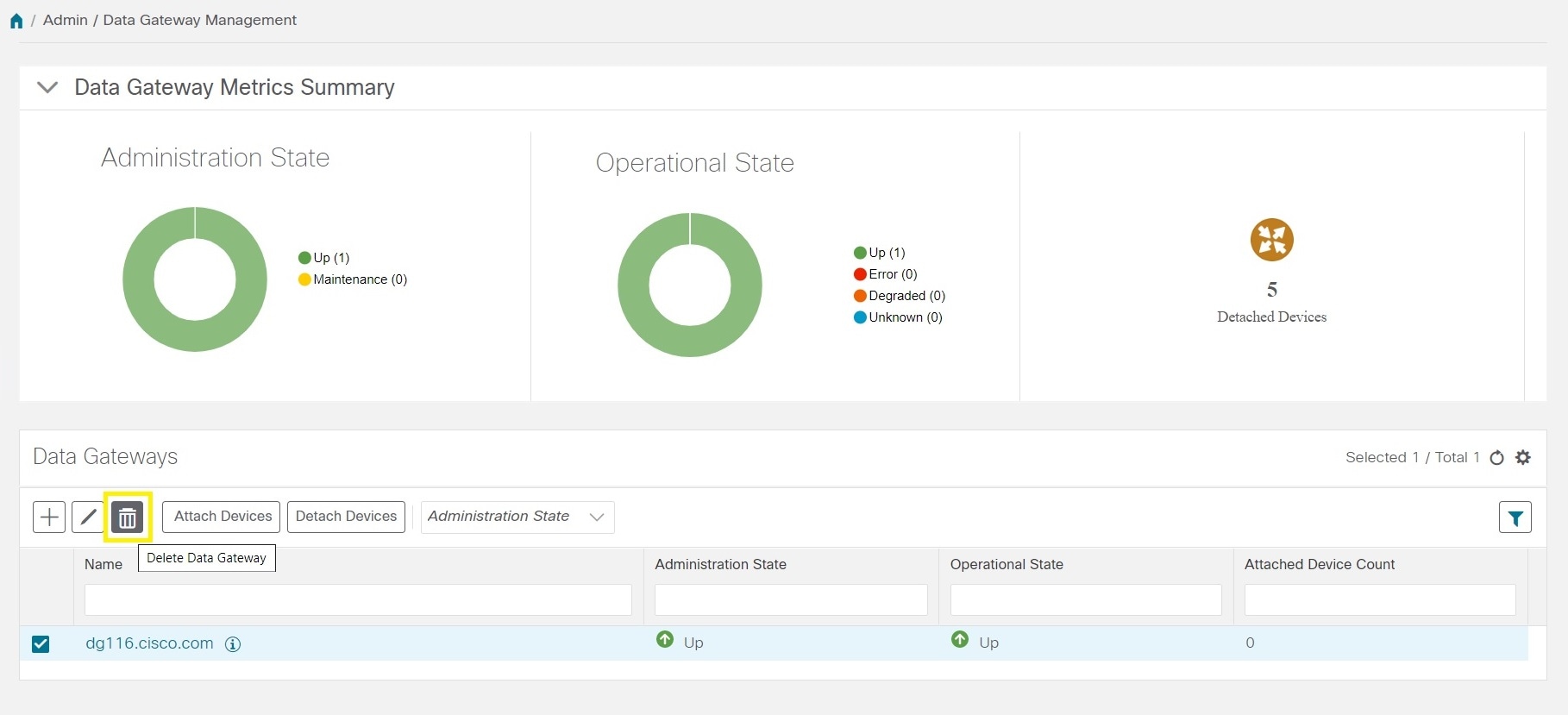 In the Data Gateways panel, select the Cisco Crosswork Data Gateway VM you want to remove and click Delete button. ![]() |