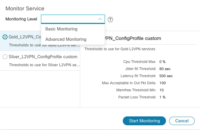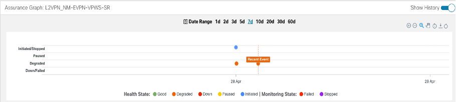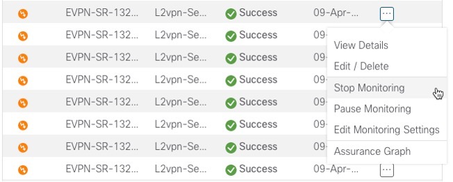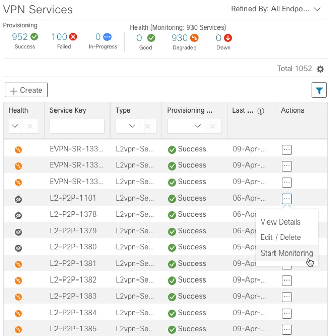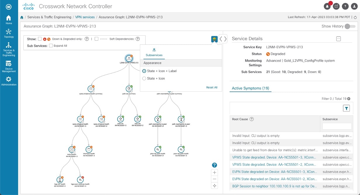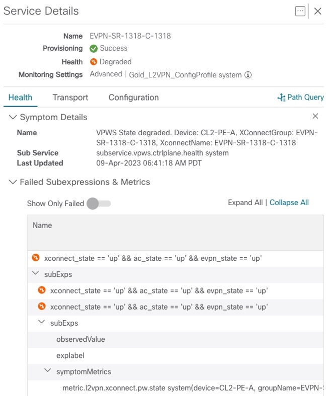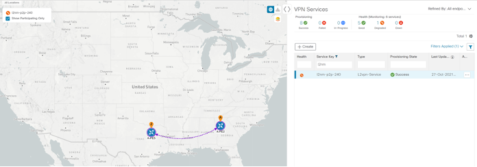The services required for this solution can be created and managed using the Crosswork Network Controller UI. L2/L3 VPN Yang model-based service intents are implemented using the Cisco Network Services Orchestrator sample function packs, which provide sample service models that can be extended and fine-tuned to meet customer needs. Optionally, Service Health monitoring can be enabled to see which services are working as provisioned, if issues have been flagged, and what symptoms are detailed so to quickly address and fix.
