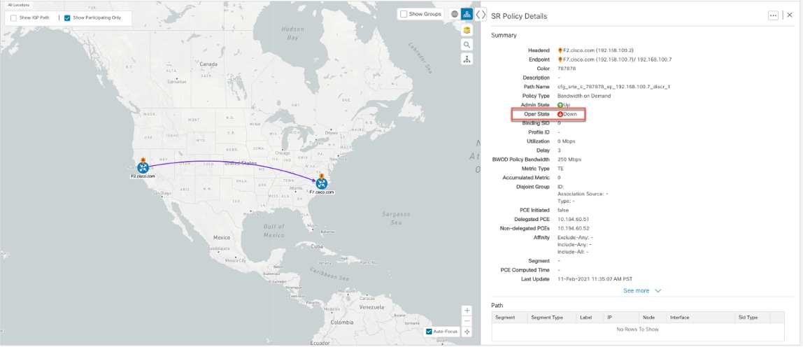 When the service is active, the network interacts with the SR-PCE to dynamically program the path that meets the intent in the configured SR-TE policy/ODN template. The headend device requests a path from the SR-PCE via PCEP (for dynamic SR-TE policies). If the request specifies bandwidth, the SR-PCE gets the path from Cisco Crosswork Optimization Engine.