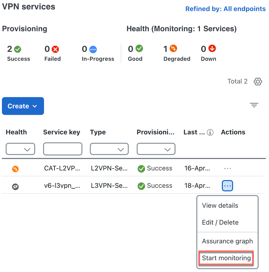 Click Start monitoring. The Health column of the service gets updated to reflected the health of the service. ![]() |