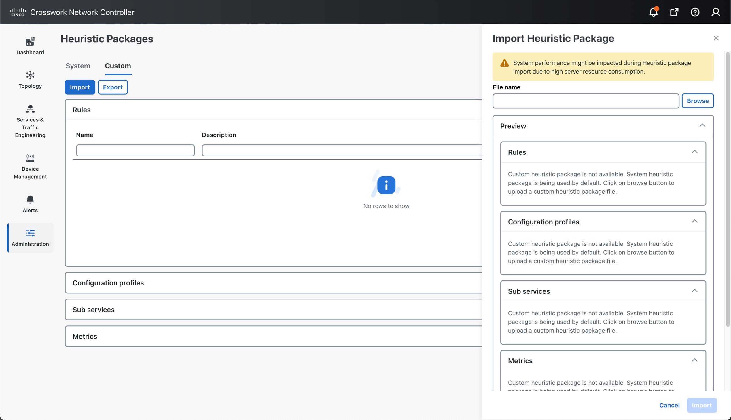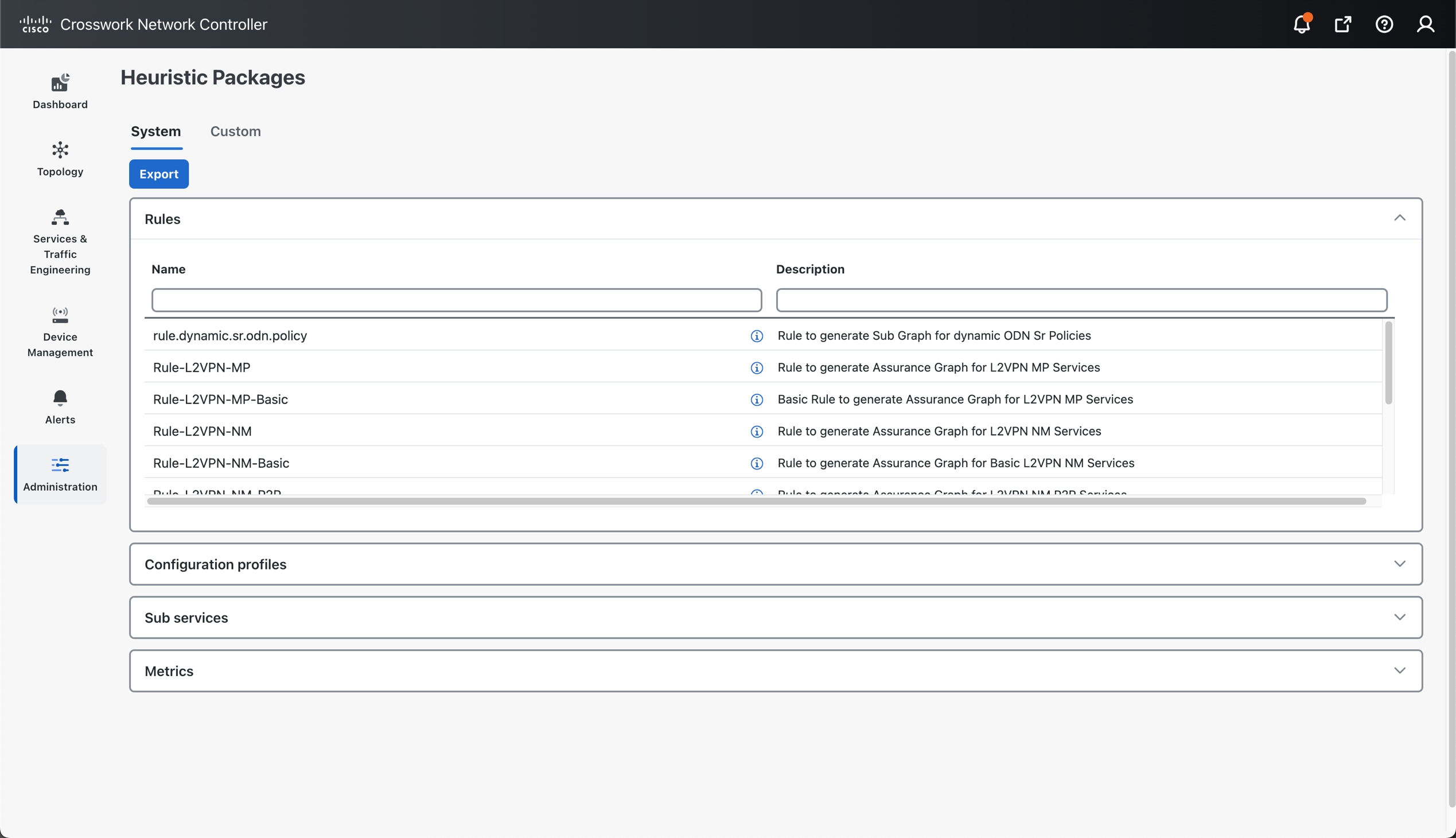 Refer to the section Create the custom Heuristic Package for a basic example of how to create a custom package by customizing the configuration profile for a service. For details or help building a custom package based on rules, metrics, or subservices, contact the Cisco Customer Experience (CX) team or your Cisco account team.