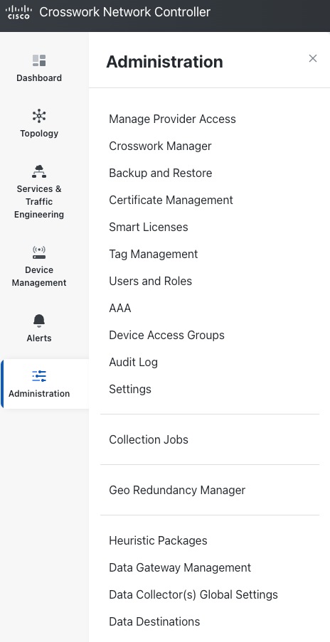 Management, and Administration menu options are available when all native Crosswork Network Controller components are installed.