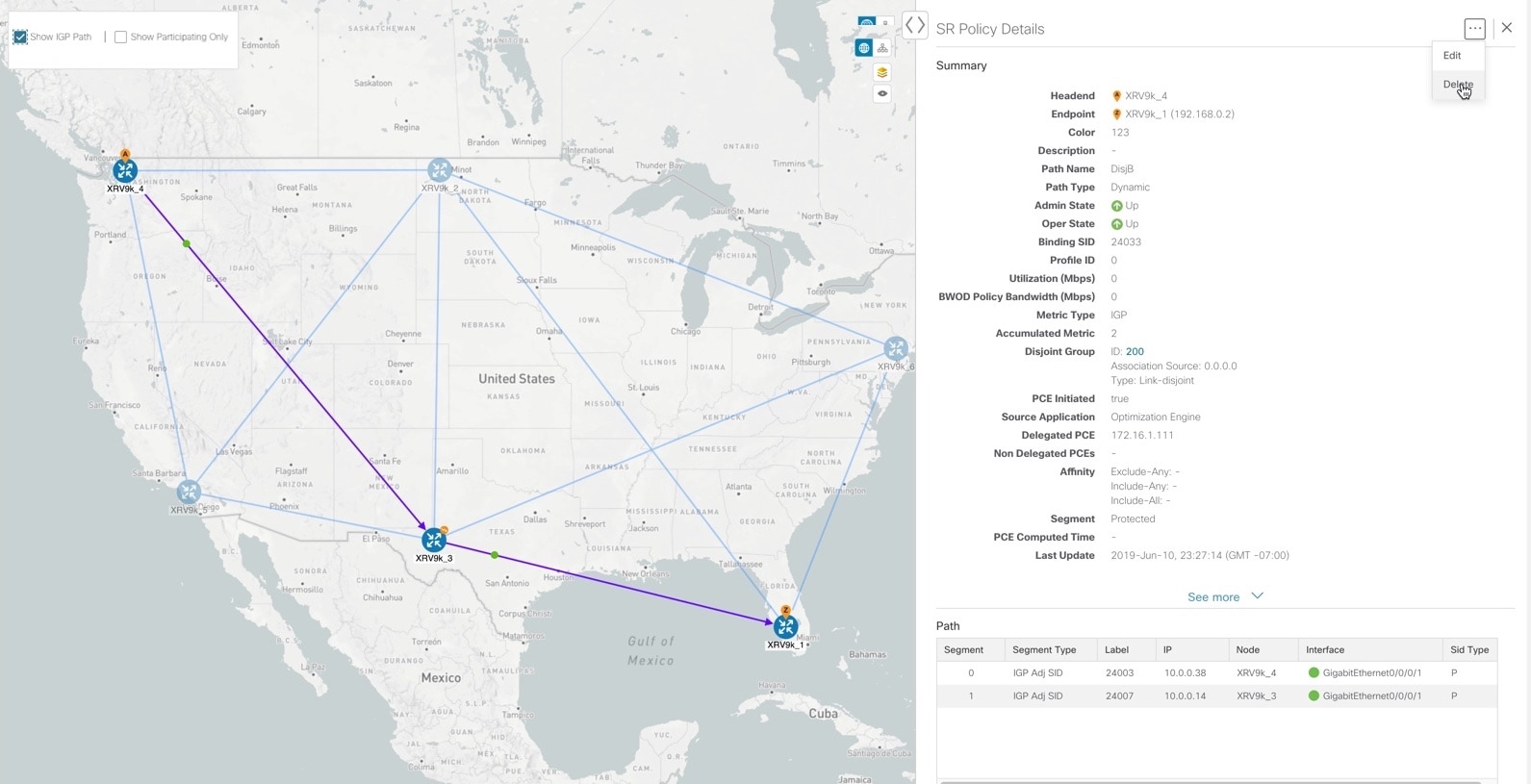 SR policy optimization objective min-metric (IGP, TE, and Latency) |
