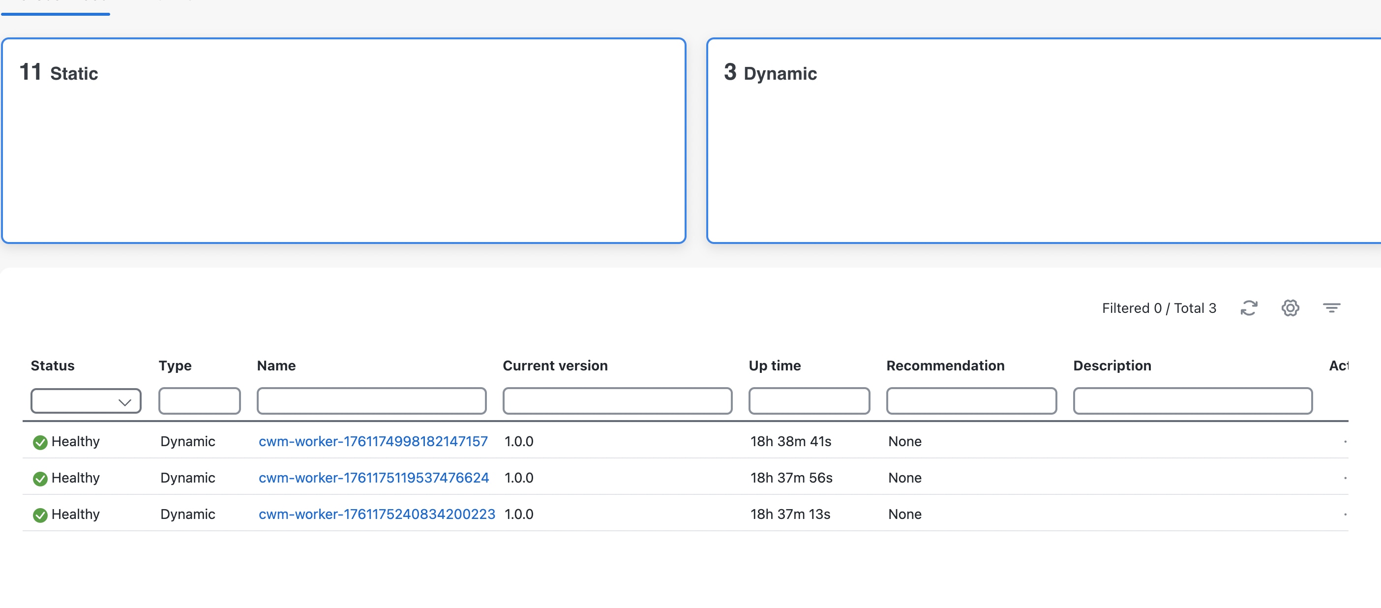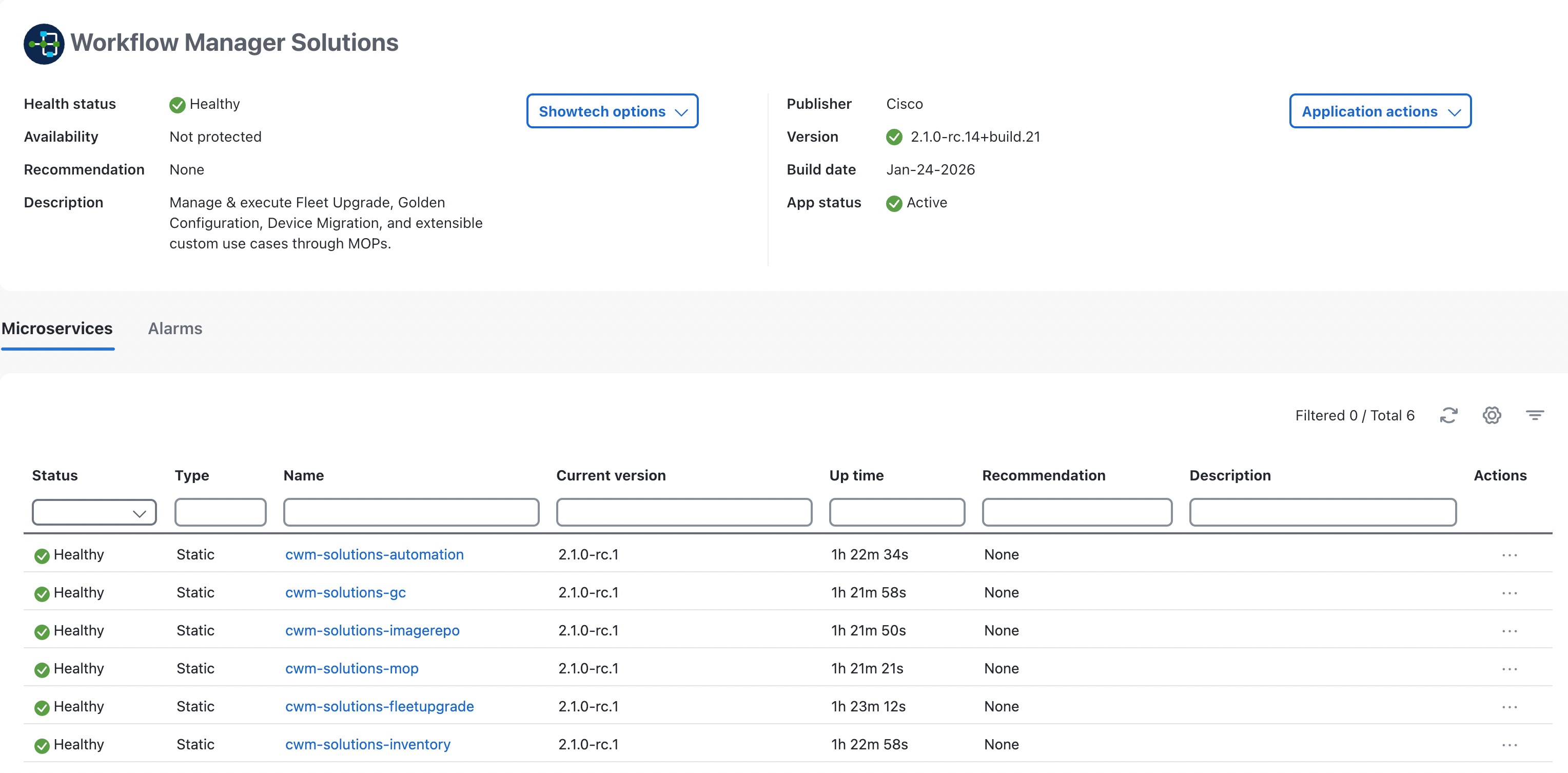 Verify successful installation by choosing . The Microservices tab displays the microservices, all with Healthy showing in the Status column. |