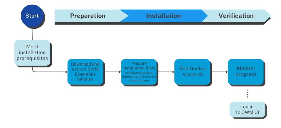 The following flowchart outlines the high-level sequence of tasks for installing CWM Essentials in a VMware environment.