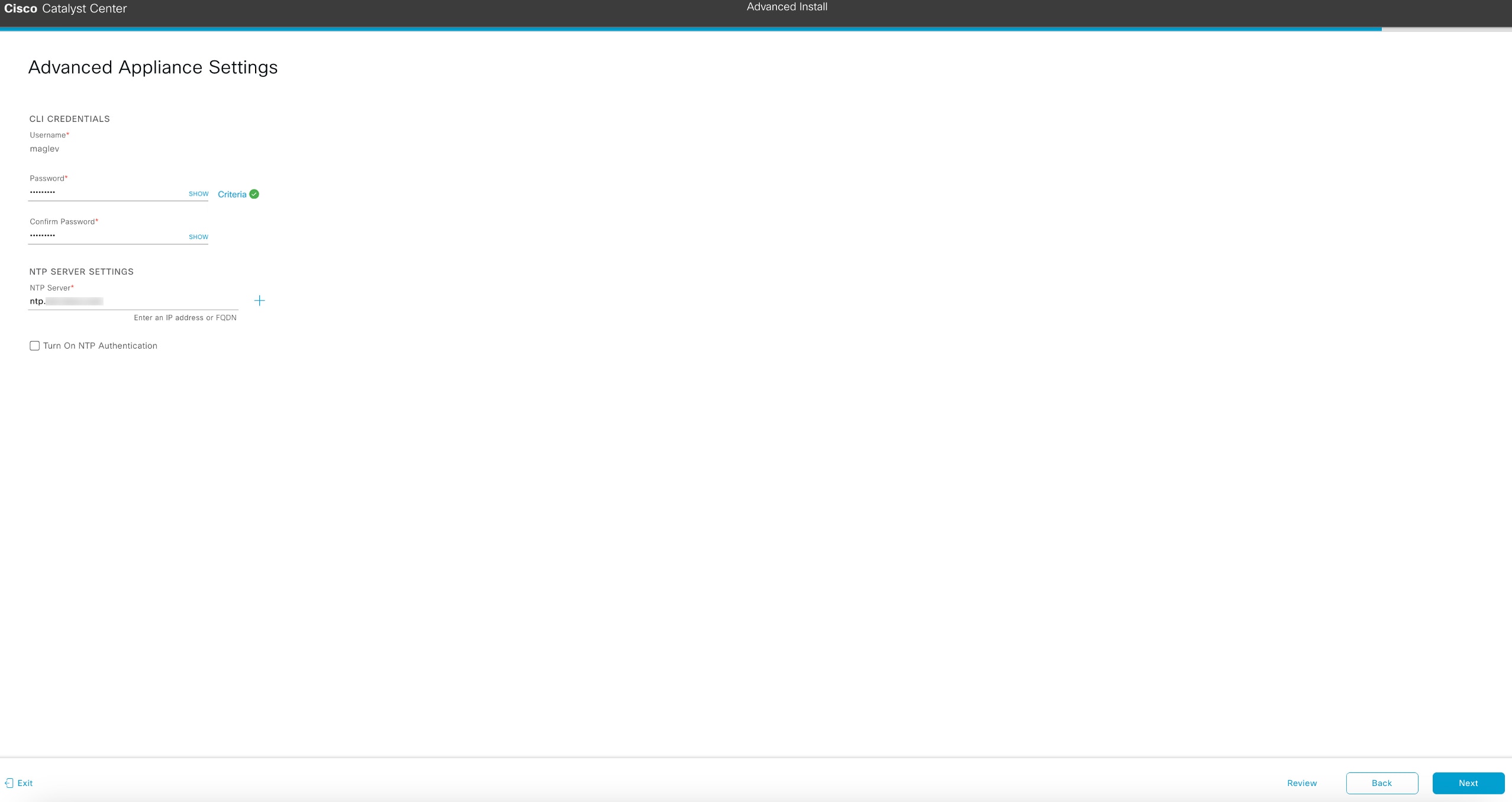 At a minimum, you must configure the interfaces on your appliance's Enterprise and Cluster ports, as they are required for Catalyst Center functionality. If the wizard fails to display either or both of these ports during the course of configuration, they may be non-functional or disabled. If you discover that they are non-functional, click Exit to exit the wizard immediately. Be sure you have completed all of the steps provided in Execute preconfiguration tasks before resuming configuration or contacting the Cisco Technical Assistance Center (TAC).