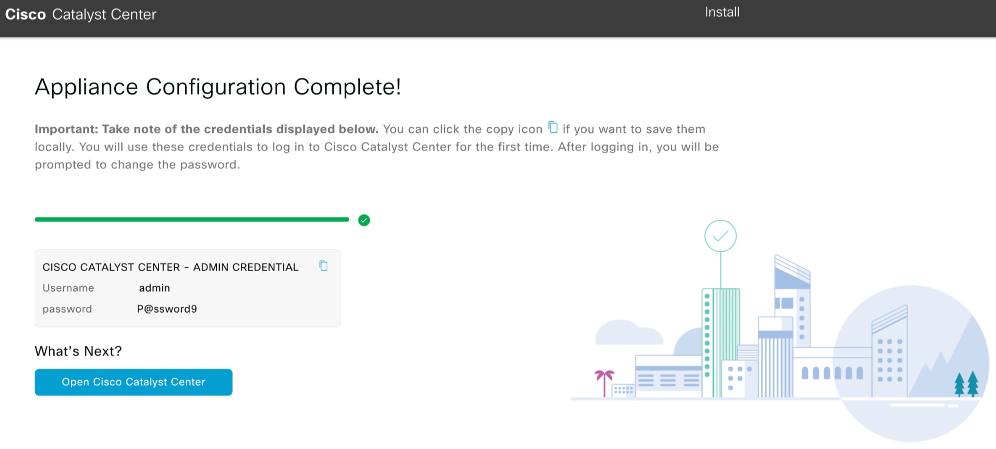 | 3. | After you complete the appliance configuration, click the copy icon in the Cisco Catalyst Center - Admin Credential area to copy the default admin superuser password.
