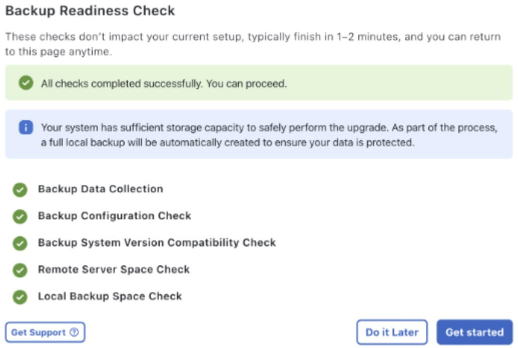 ![]() Click Run Backup Readiness Check. One of these checks determines whether your upgrade workflow will include the automatic creation of a full local backup by checking these conditions: