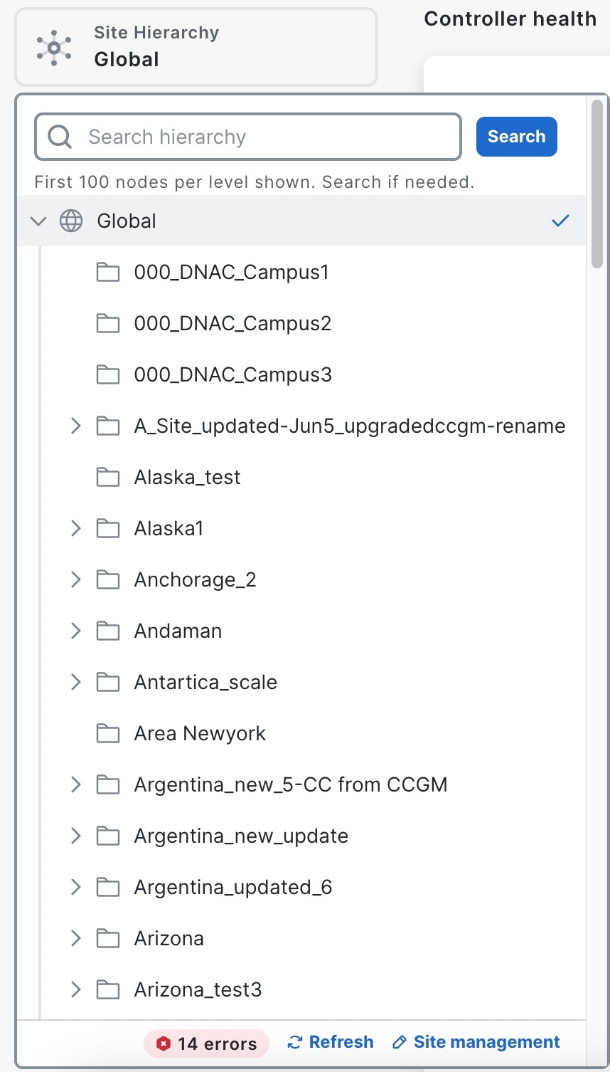 For these events, there's no need to manually click the Refresh button. In contrast, an on-demand refresh in the Catalyst Center Global Manager site selector is required when there are changes to the sites on the controller side, such as adding, deleting, or modifying sites.
