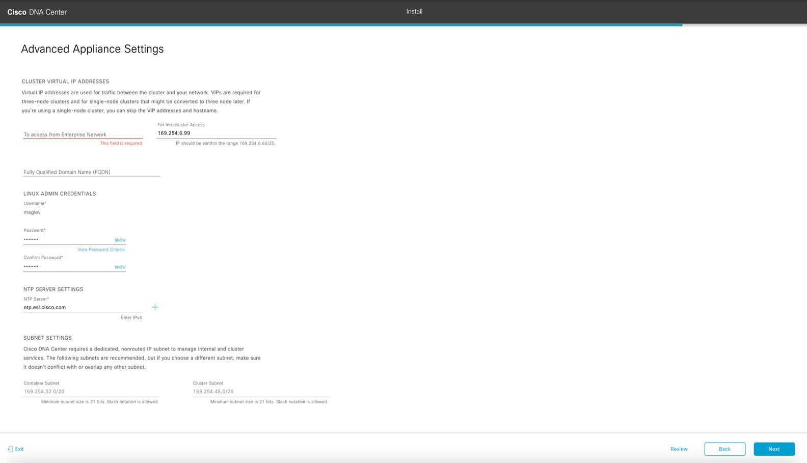 A dedicated, non-routed IP subnet that Cisco DNA Center uses to manage internal cluster services. By default, this is already set to 169.254.48.0/20, and we recommend that you use this subnet. If you choose to enter another subnet, ensure that it does not conflict with
