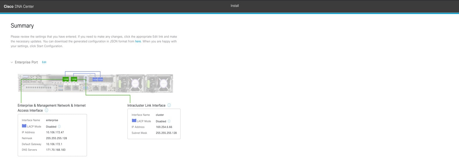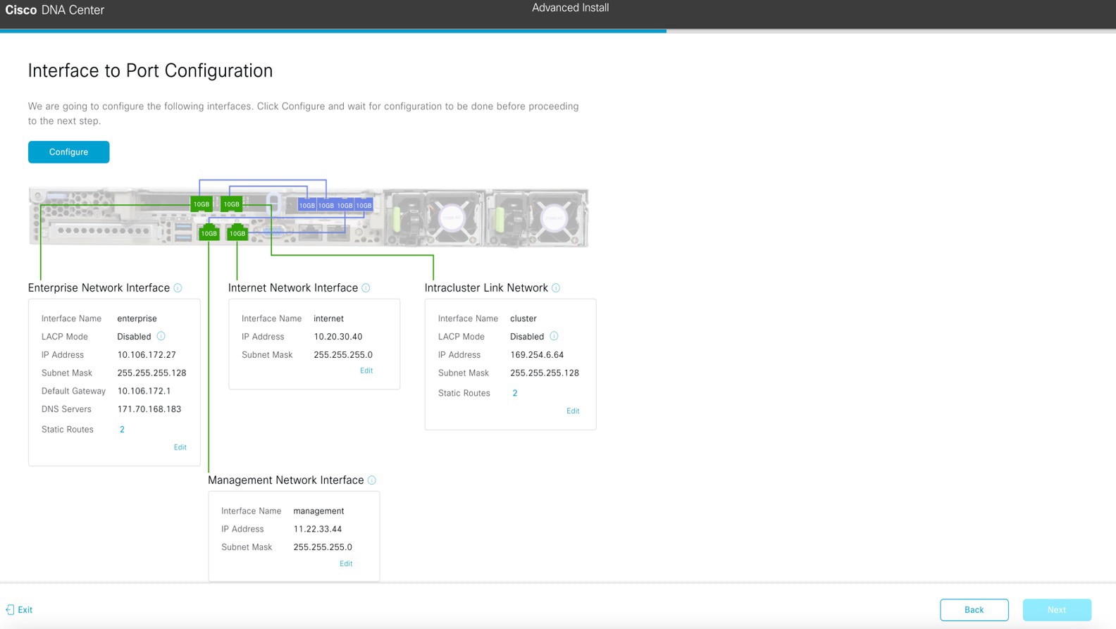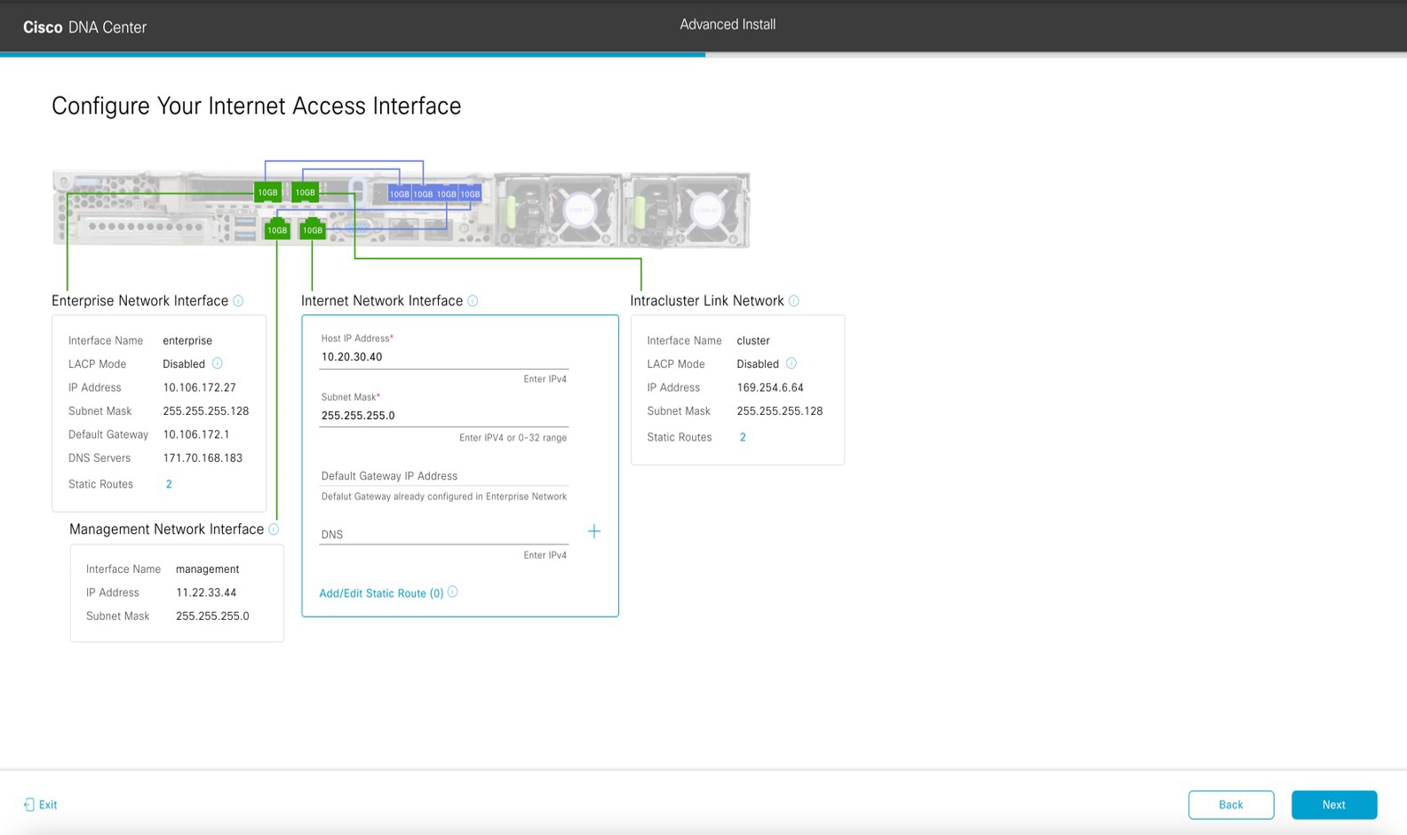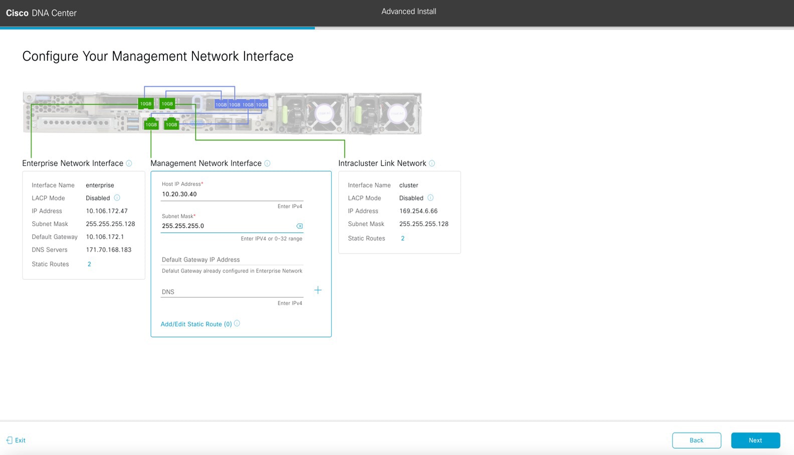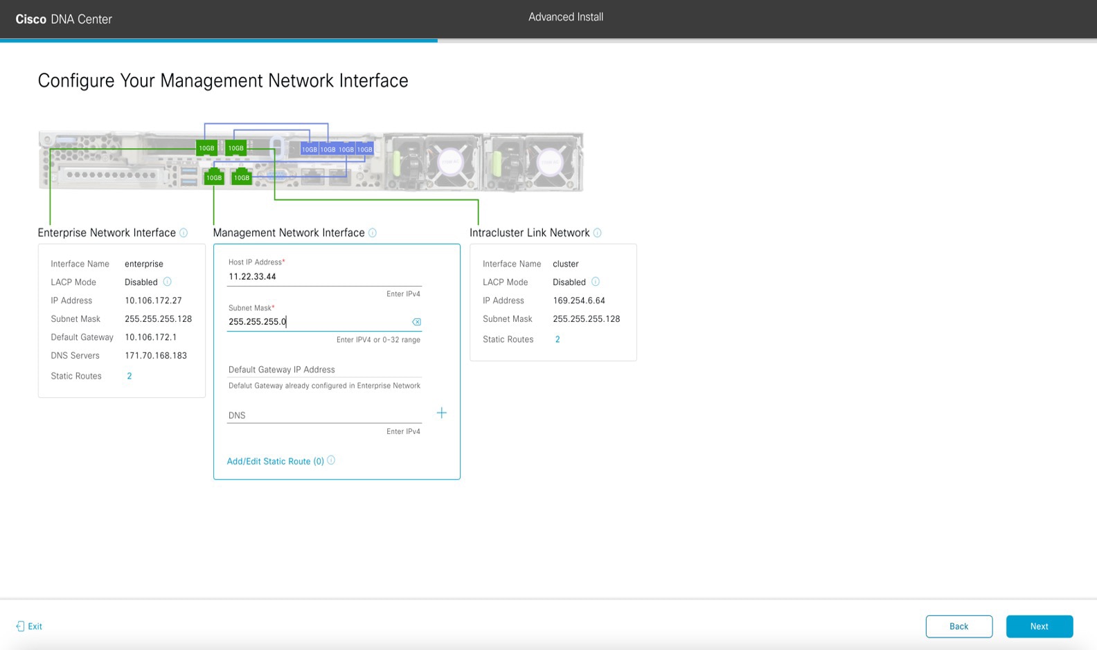As explained in Interface Cable Connections, this port is used to access the Cisco DNA Center GUI from your management network. If you chose to configure a dedicated Management interface, enter the information described