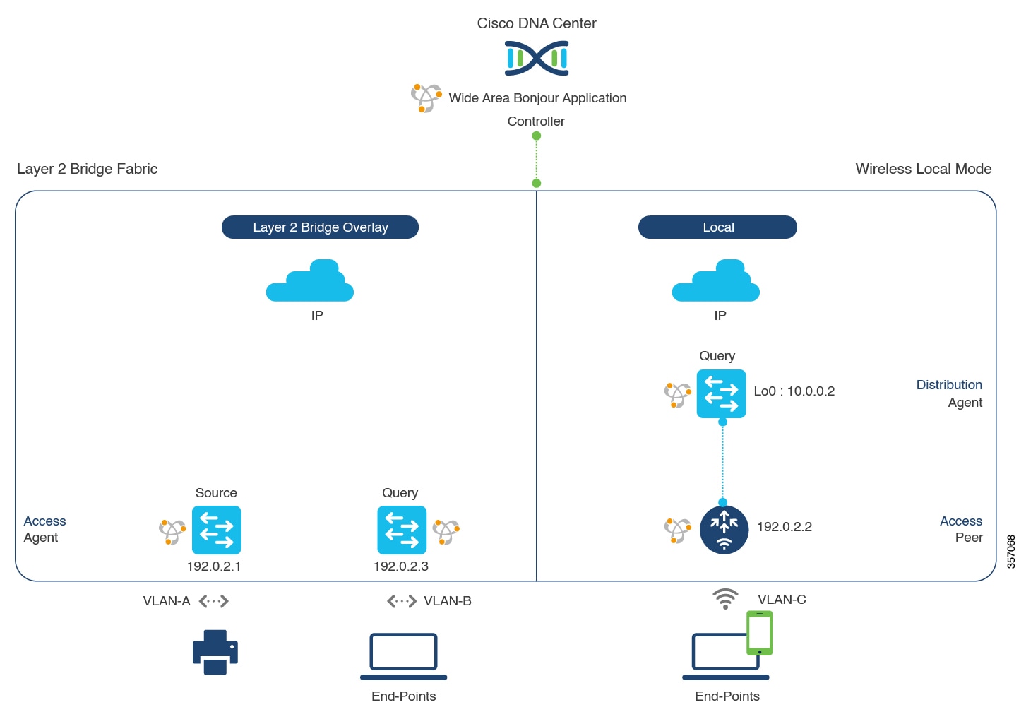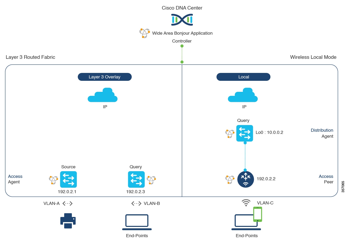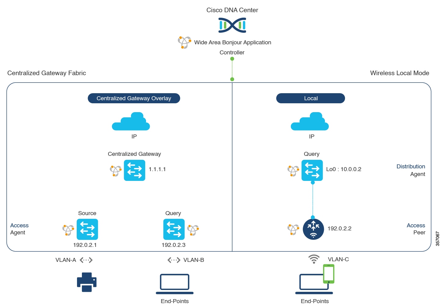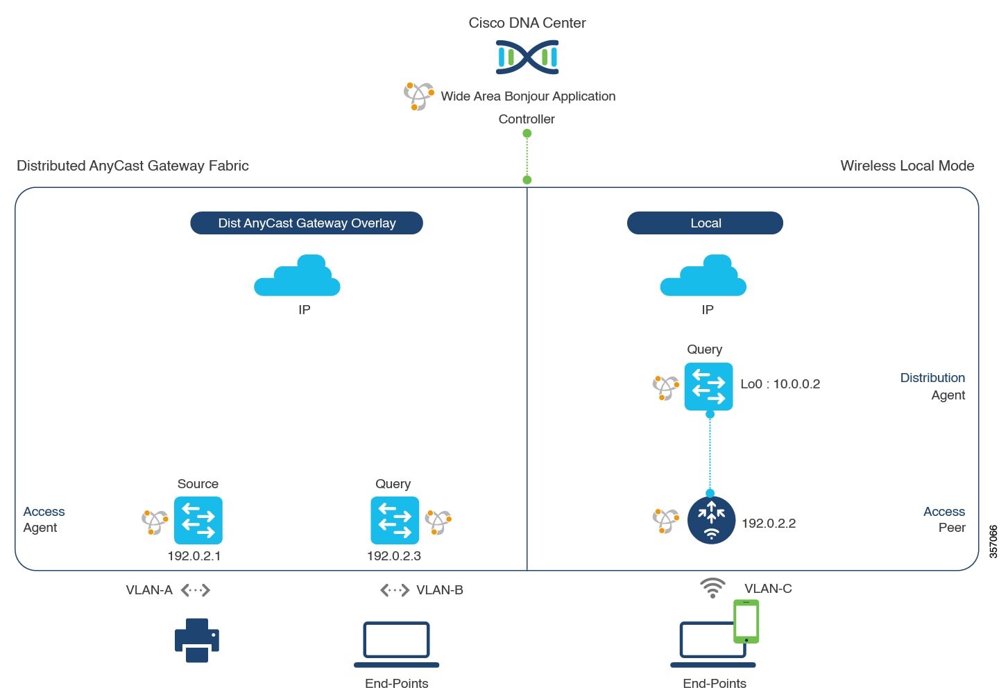 Cisco Wide Area Bonjour supports various types of BGP EVPN overlay networks for wired and traditional wireless LAN in Local mode network deployment models. This chapter provides step-by-step configuration to implement global service filter policies in the Cisco Wide Area Bonjour application, which enables network-wide service routing functions for Layer 3 or Layer 2 overlay virtual network environments, without extending the Layer 2 flood boundary.