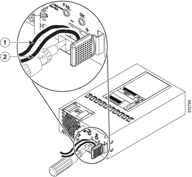 The color coding of the DC input power supply leads depends on the color coding of the DC power source at your site. Ensure that the lead color coding you choose for the DC input power supply matches the lead color coding used at the DC power source and verify that the power source is connected to the negative (–) terminal and to the positive (+) terminal on the power supply.